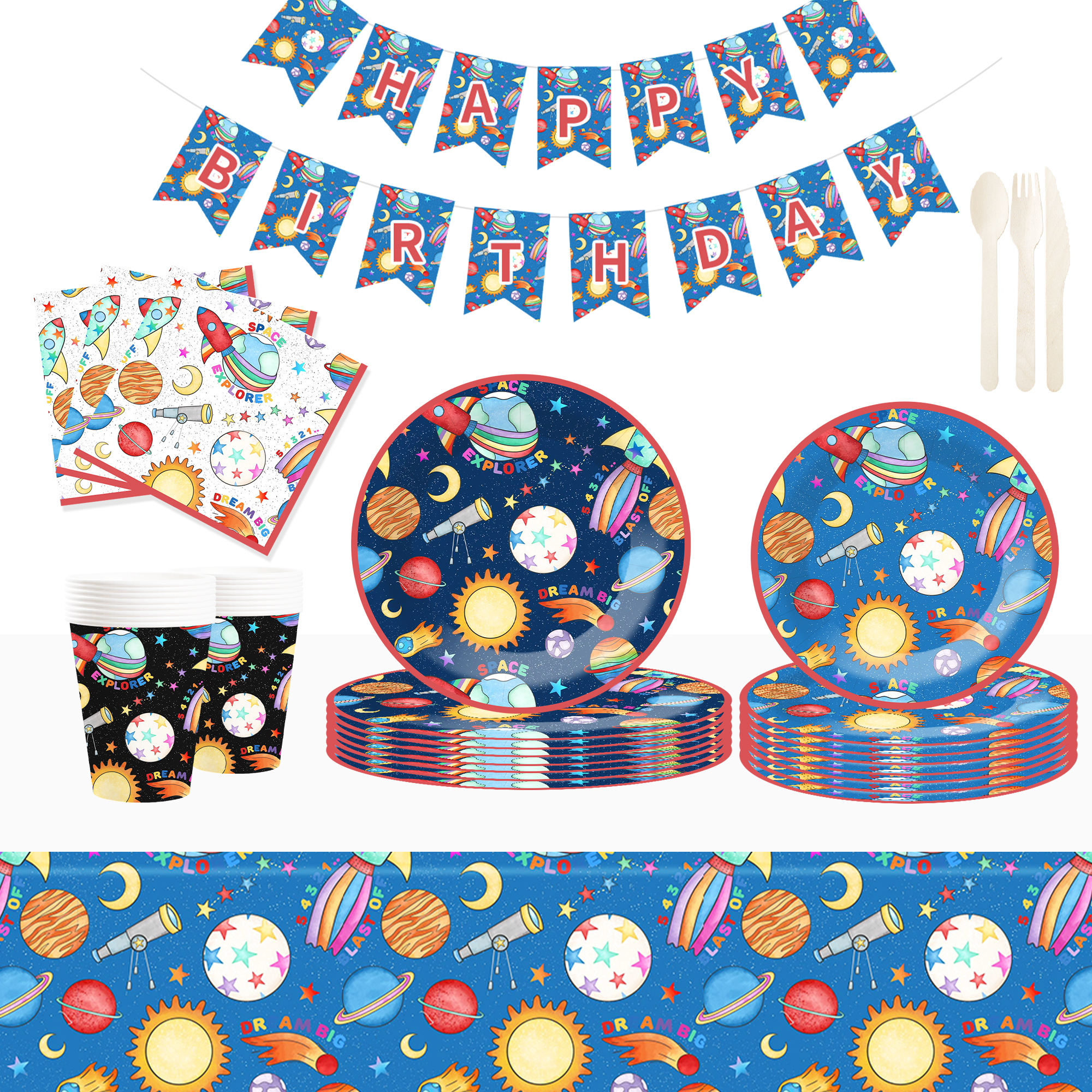 Blue Space Theme Happy Birthday Paper Banner with Planet and Rocket for Boys Party